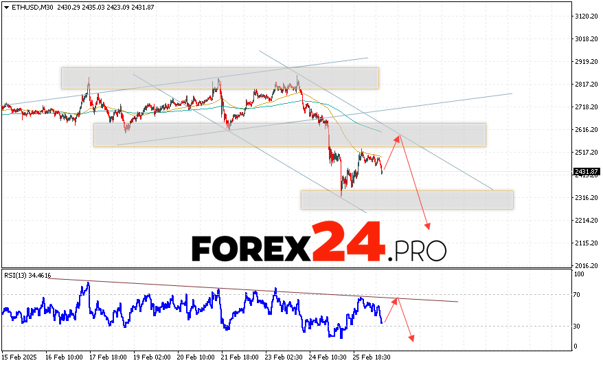 Ethereum Forecast and Analysis for February 27, 2025 suggests an attempt at a bullish correction and a test of the resistance area near the 2585 level. Where should we expect a rebound and continued fall of the ETH/USD cryptocurrency to the area below the 2175 level. An additional signal in favor of a decline in Ethereum will be a test of the trend line on the relative strength indicator. The cancellation of the digital currency fall option will be a breakout of the 2835 area. Which will indicate continued growth of the digital currency with a potential target above the 3375 level.