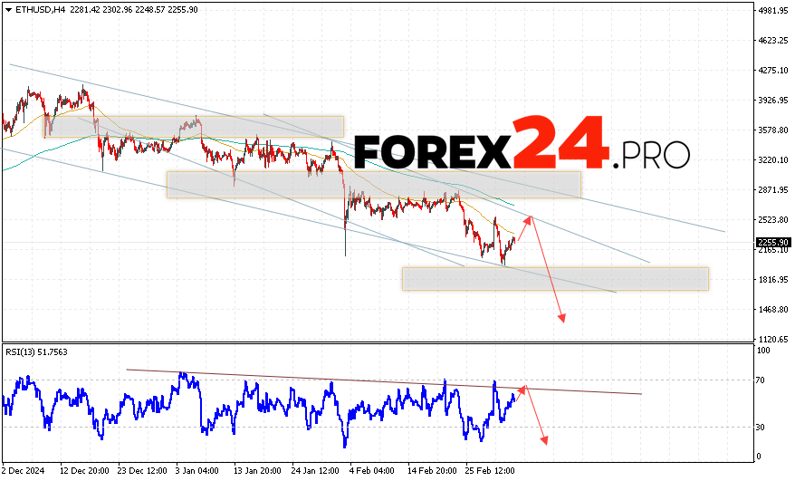Ethereum Forecast and Analysis for March 7, 2025 suggests an attempt at a bullish correction and a test of the resistance area near the 2525 level. Where should we expect a rebound and continued fall of the ETH/USD cryptocurrency to the area below the 1385 level. An additional signal in favor of a decline in Ethereum will be a test of the trend line on the relative strength indicator. The cancellation of the digital currency fall option will be a breakout of the 2775 area. Which will indicate continued growth of the digital currency with a potential target above the 3285 level.