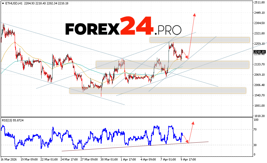 Ethereum Forecast and ETH/USD Analysis for April 10, 2026 suggests an attempt at a bearish correction and a test of the support area near 2165. From there, a rebound and continued growth in the ETH/USD cryptocurrency to above 2465 should be expected. A test of the trend line on the relative strength indicator (RSI) would be an additional signal of an uptrend for Ethereum. A break of the support area at 2075 would invalidate the digital currency’s upward trend, indicating continued decline with a potential target below 1685.