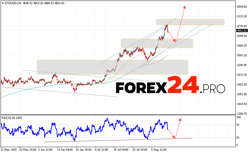 Ethereum Forecast and ETH/USD Analysis for August 15, 2025 suggests an attempt at a bearish correction and a test of the support area near the 4245 level. From there, we can expect a rebound and continued growth of the ETH/USD cryptocurrency to an area above the 5505 level. An additional signal in favor of Ethereum’s growth will be a test of the trend line on the relative strength indicator. A breakout of the support area at 3845 will cancel the option of a rise in the digital currency. This will indicate a continuation of the digital currency’s decline with a potential target below the 3605 level.