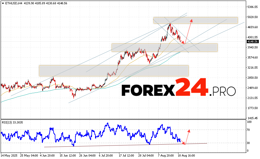 Ethereum Forecast and ETH/USD Analysis for August 20, 2025 suggests an attempt at a bearish correction and a test of the support area near the 4065 level. From there, we can expect a rebound and continued growth of the ETH/USD cryptocurrency to an area above the 4875 level. An additional signal in favor of Ethereum’s growth will be a test of the trend line on the relative strength indicator. A breakout of the support area at 3725 will cancel the option of a rise in the digital currency. This will indicate a continuation of the digital currency’s decline with a potential target below the 3435 level.