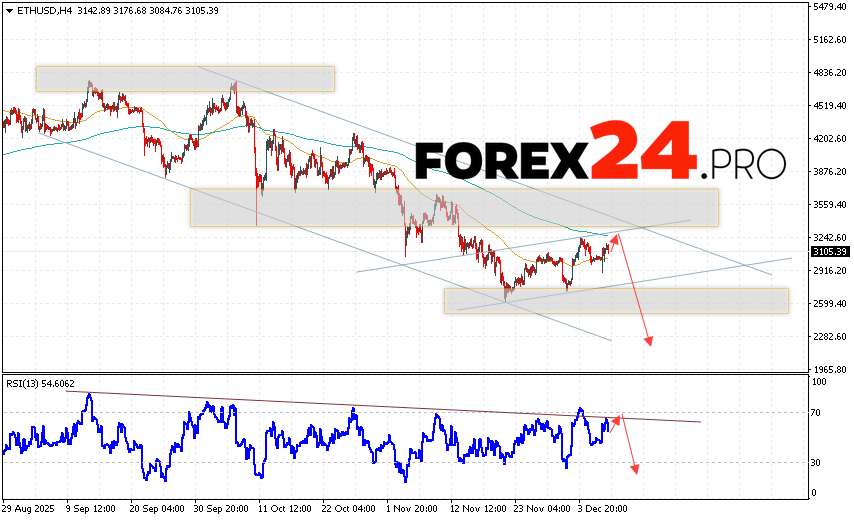 Ethereum Forecast and ETH/USD Analysis for December 9, 2025 suggests an attempt at a bullish correction and a test of the resistance area near 3225. From there, a rebound and continued growth in the ETH/USD cryptocurrency to below 2275 should be expected. A test of the trendline on the relative strength indicator (RSI) would be an additional signal of a decline in Ethereum. A break of the resistance area at 3635 would invalidate this downward scenario, indicating continued growth with a potential target above 4265.