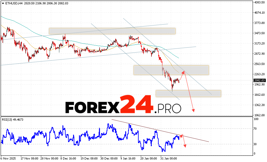 Ethereum Forecast and ETH/USD Analysis for February 10, 2026 suggests an attempt at a bullish correction and a test of the resistance area near 2325. From there, a rebound and continued decline in ETH/USD to below 1175 should be expected. A test of the trendline on the relative strength indicator (RSI) would be an additional signal for Ethereum’s downward scenario. A breakout of the 2805 resistance area would cancel the digital currency’s downward scenario. This would indicate a continued rally in the digital currency with a potential target above 3365.