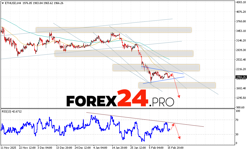 Ethereum Forecast and ETH/USD Analysis for February 17, 2026 suggests an attempt at a bullish correction and a test of the resistance area near 1985. From there, a rebound and continued decline in the ETH/USD cryptocurrency to below 1295 should be expected. A test of the trend line on the relative strength indicator (RSI) would be an additional signal for a decline in Ethereum. A break of the resistance area at 2265 would invalidate the downward trend, indicating continued upward movement with a potential target above 2775.