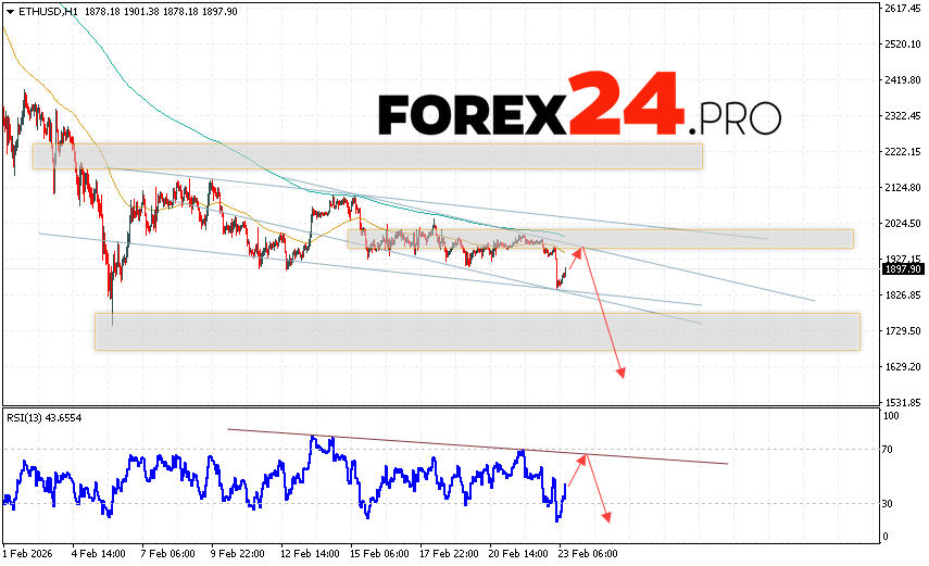 Ethereum Forecast and ETH/USD Analysis for February 24, 2026 suggests an attempt at a bullish correction and a test of the resistance area near 1945. From there, a rebound and continued decline in the ETH/USD cryptocurrency to below 1625 should be expected. A test of the trendline on the relative strength indicator (RSI) would be an additional signal for a decline in Ethereum. A break of the resistance area at 2175 would invalidate the downward trend, indicating continued upward movement with a potential target above 2665.