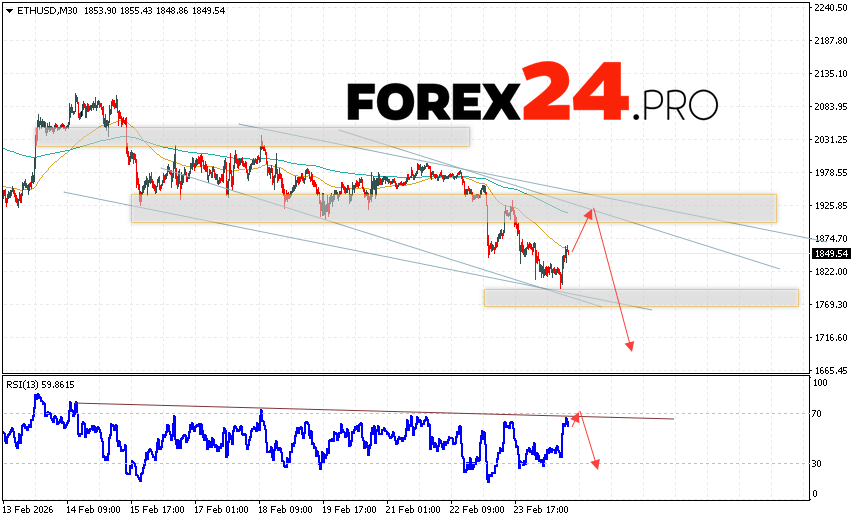 Ethereum Forecast and ETH/USD Analysis for February 25, 2026 suggests an attempt at a bullish correction and a test of the resistance area near 1925. From there, a rebound and continued decline in the ETH/USD cryptocurrency to below 1645 should be expected. A test of the trendline on the relative strength indicator (RSI) would be an additional signal for a decline in Ethereum. A break of the resistance area at 2055 would invalidate the downward trend, indicating continued upward movement with a potential target above 2665.