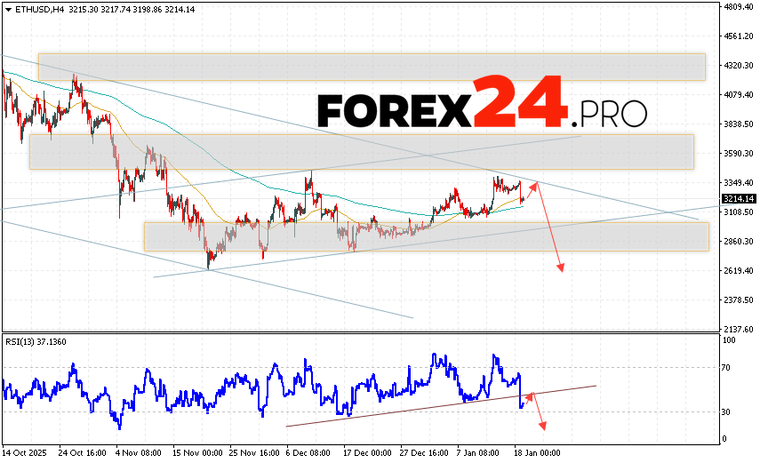 Ethereum Forecast and ETH/USD Analysis for January 20, 2026 suggests an attempt at a bullish correction and a test of the resistance area near 3305. From there, a rebound and continued decline in the ETH/USD cryptocurrency to below 2625 should be expected. A test of the trendline on the relative strength indicator (RSI) would be an additional signal for a decline in Ethereum. A break of the 3625 resistance area would invalidate the downward trend, indicating continued upside with a potential target above 4045.