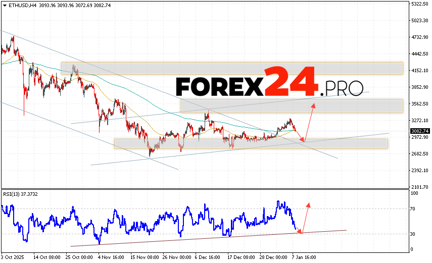 Ethereum Forecast and ETH/USD Analysis for January 9, 2026 suggests an attempt at a bearish correction and a test of the support area near 2935. From there, a rebound and continued growth in ETH/USD to above 3545 should be expected. A test of the trendline on the relative strength indicator (RSI) would be an additional signal in favor of Ethereum’s upside. The digital currency’s upside scenario would be cancelled if the 2845 support area is broken, indicating a continued decline in the digital currency with a potential target below 2185.