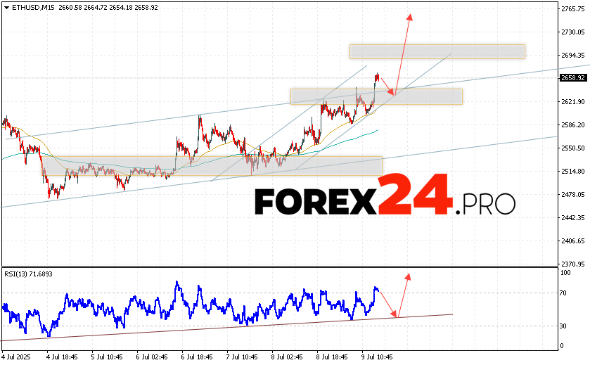 Ethereum Forecast and ETH/USD Analysis for July 10, 2025 suggests an attempt at a bearish correction and a test of the support area near the 2625 level. From there, we can expect a rebound and continued growth of the ETH/USD cryptocurrency to the area above the 2805 level. An additional signal in favor of Ethereum’s growth will be a test of the trend line on the relative strength indicator. A breakout of the 2525 support area will cancel the option of a rise in the digital currency. This will indicate a continuation of the digital currency’s decline with a potential target below the 2245 level.