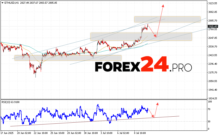 Ethereum Forecast and ETH/USD Analysis for July 11, 2025 suggests an attempt at a bearish correction and a test of the support area near the 2645 level. From there, we can expect a rebound and continued growth of the ETH/USD cryptocurrency to above the 3125 level. An additional signal in favor of Ethereum’s growth will be a test of the trend line on the relative strength indicator. A breakout of the 2485 support area will cancel the digital currency’s rise. This will indicate a continuation of the digital currency’s decline with a potential target below the 2305 level.