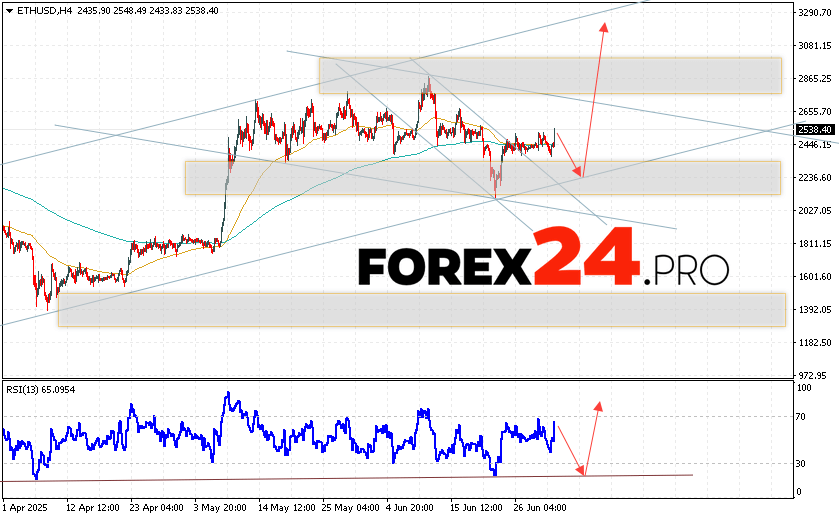Ethereum Forecast and ETH/USD Analysis for July 3, 2025 suggests an attempt at a bearish correction and a test of the support area near the 2235 level. From there, we can expect a rebound and continued growth of the ETH/USD cryptocurrency to the area above the 3125 level. An additional signal in favor of Ethereum’s rise will be a test of the trend line on the relative strength indicator. A breakout of the 2185 support area will cancel the digital currency’s growth scenario. This will indicate a continuation of the digital currency’s decline with a potential target below the 1865 level.