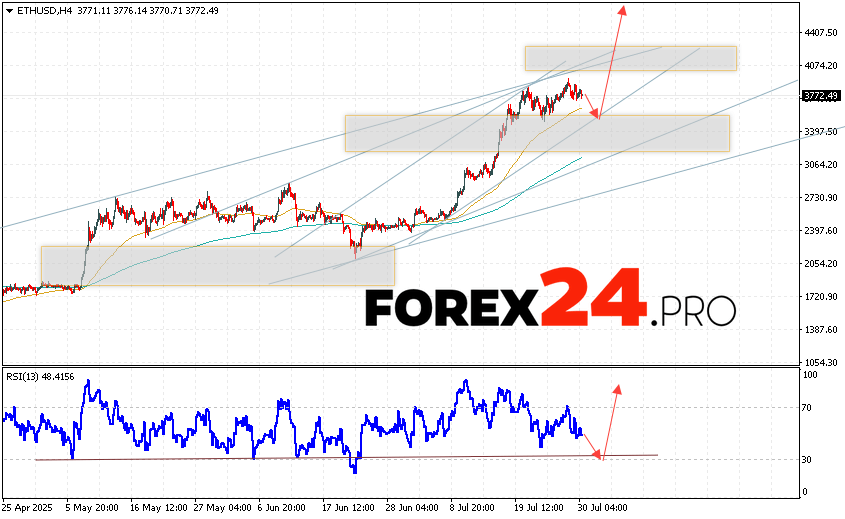 Ethereum Forecast and ETH/USD Analysis for July 31, 2025 suggests an attempt at a bearish correction and a test of the support area near the 3445 level. From there, we can expect a rebound and continued growth of the ETH/USD cryptocurrency to an area above the 4575 level. An additional signal in favor of Ethereum’s growth will be a test of the trend line on the relative strength indicator. A breakout of the support area at 3295 will cancel the option of a rise in the digital currency. This will indicate a continuation of the digital currency’s decline with a potential target below the 2975 level.