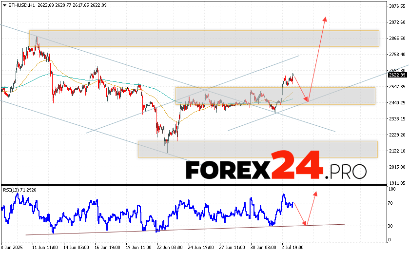 Ethereum Forecast and ETH/USD Analysis for July 4, 2025 suggests an attempt at a bearish correction and a test of the support area near the 2455 level. Where should we expect a rebound and continued growth of the ETH/USD cryptocurrency to the area above the 2975 level. An additional signal in favor of the rise of Ethereum will be a test of the trend line on the relative strength indicator. The breakdown of the support area of 2305 will cancel the growth option of the digital currency. This will indicate a continuation of the fall of the digital currency with a potential target below the level of 1965.