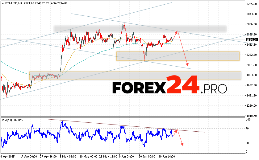 ETH/USD Ethereum forecast for July 8, 2025 suggests an attempt at a bearish correction and a test of the resistance area near the 2635 level. From where we should expect a rebound and a continuation of the ETH/USD cryptocurrency’s fall to the area below the 2025 level. An additional signal in favor of the fall of Ethereum will be a test of the trend line on the relative strength indicator. A breakdown of the support area of 2865 will cancel the option of the digital currency fall. This will indicate the continuation of growth of digital currency with a potential target above the level of 3245.