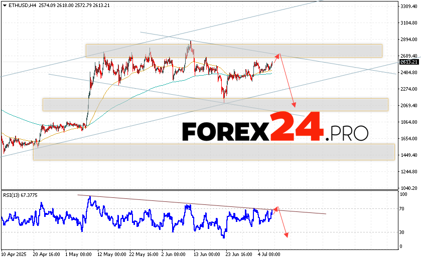 Ethereum Forecast and ETH/USD Analysis for July 9, 2025suggests an attempt at a bearish correction and a test of the resistance area near the 2685 level. From there, we can expect a rebound and a continuation of the decline of the ETH/USD cryptocurrency to an area below the 2065 level. An additional signal in favor of Ethereum’s decline will be a test of the trend line on the relative strength indicator. A breakout of the 2865 support area will cancel the decline scenario for the digital currency. This will indicate a continuation of the digital currency’s growth with a potential target above the 3245 level.