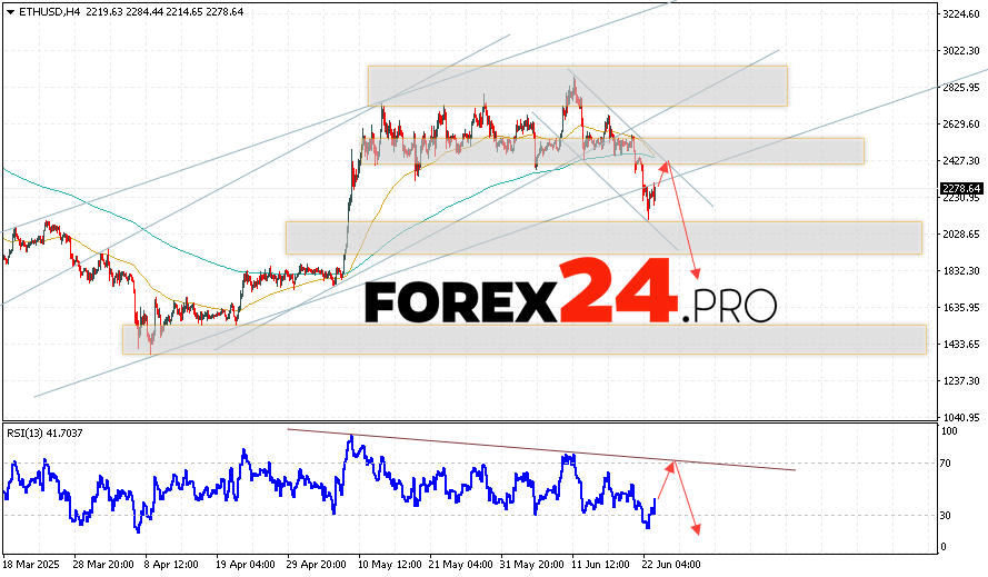 Ethereum Forecast and ETH/USD Analysis for June 24, 2025 suggests an attempt at a bullish correction and a test of the resistance area near the 2415 level. From there, we can expect a rebound and a continuation of the decline in the ETH/USD cryptocurrency to an area below the 1775 level. An additional signal in favor of a decline in Ethereum will be a test of the trend line on the relative strength indicator. A breakout of the resistance area at 2725 will cancel the scenario of a decline in the digital currency. This will indicate a continuation of the growth of the digital currency with a potential target above the level of 3165.