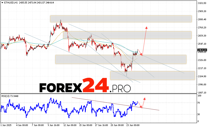 Ethereum Forecast and ETH/USD Analysis for June 25, 2025 suggests an attempt at a bearish correction and a test of the support area near the 2365 level. From there, we can expect a rebound and continued growth of the ETH/USD cryptocurrency to an area above the 2765 level. An additional signal in favor of Ethereum’s growth will be a test of the trend line on the relative strength indicator. A breakout of the support area at 2305 will cancel the option of a rise in the digital currency. This will indicate a continuation of the digital currency’s decline with a potential target below the 2005 level.