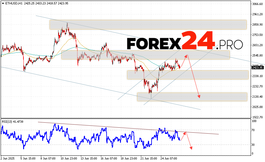 Ethereum Forecast and ETH/USD Analysis for June 27, 2025 suggests an attempt at a bearish correction and a test of the resistance area near the 2535 level. From there, we can expect a rebound and a continuation of the decline in the ETH/USD cryptocurrency to an area below the 2115 level. An additional signal in favor of Ethereum’s decline will be a test of the trend line on the relative strength indicator. A breakout of the resistance area at 2705 will cancel the decline scenario for the digital currency. This will indicate a continuation of the digital currency’s growth with a potential target above the 2995 level.