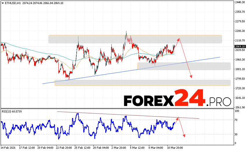 Ethereum Forecast and ETH/USD Analysis for March 12, 2026 suggests an attempt at a bullish correction and a test of the resistance area near 2135. From there, a rebound and continued decline in the ETH/USD cryptocurrency to below 1805 should be expected. A test of the trendline on the relative strength indicator (RSI) would be an additional signal for a decline in Ethereum. A break of the resistance area at 2445 would invalidate the downward trend, indicating continued growth with a potential target above 2905.