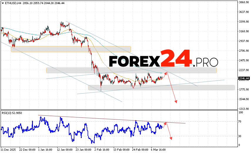 Ethereum Forecast and ETH/USD Analysis for March 13, 2026 suggests an attempt at a bullish correction and a test of the resistance area near 2165. From there, a rebound and continued decline in the ETH/USD cryptocurrency to below 1535 should be expected. A test of the trendline on the relative strength indicator (RSI) would be an additional signal for a decline in Ethereum. A break of the resistance area at 2445 would invalidate the downward trend, indicating continued growth with a potential target above 2885.