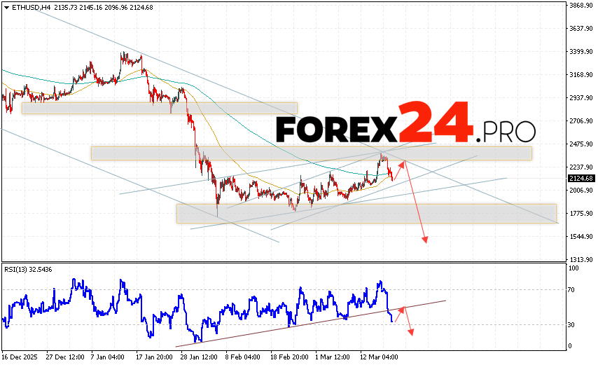 Ethereum Forecast and ETH/USD Analysis for March 20, 2026 suggests an attempt at a bullish correction and a test of the resistance area near 2245. From there, a rebound and continued decline in the ETH/USD cryptocurrency to below 1535 should be expected. A test of the trendline on the relative strength indicator (RSI) would be an additional signal for a decline in Ethereum. A break of the support area at 2505 would invalidate the downward trend, indicating continued upside with a potential target above 2995.