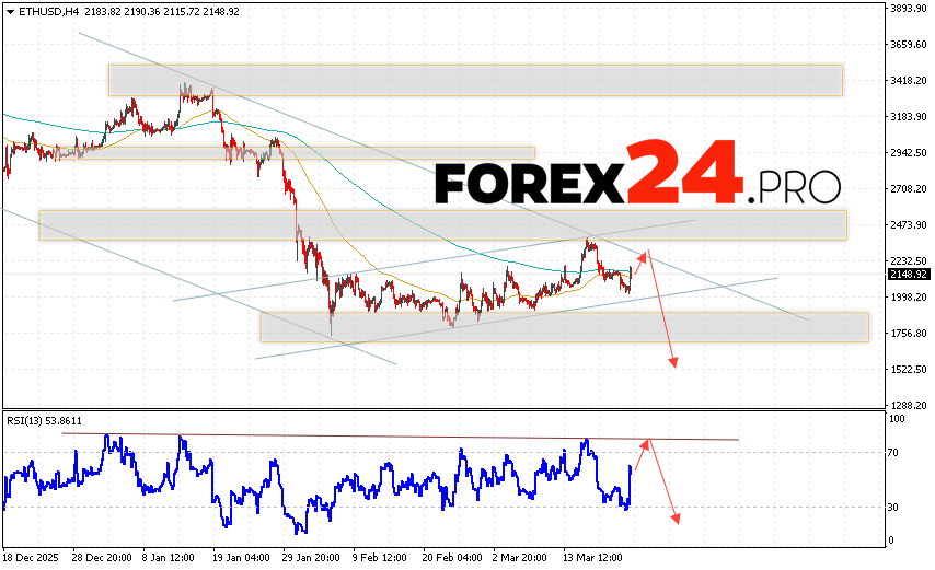 Ethereum Forecast and ETH/USD Analysis for March 24, 2026 suggests an attempt at a bullish correction and a test of the resistance area near 2230. From there, a rebound and continued decline in the ETH/USD cryptocurrency to below 1525 should be expected. A test of the trendline on the relative strength indicator (RSI) would be an additional signal for a decline in Ethereum. A break of the support area at 2505 would invalidate the downward trend, indicating continued upside with a potential target above 2845.