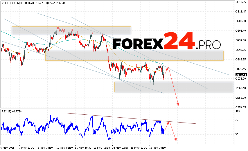 Ethereum Forecast and ETHUSD Analysis for November 19, 2025 suggests an attempt at a bullish correction and a test of the resistance area near 3175. From there, a rebound and continued growth in ETH/USD to below 2765 should be expected. A test of the trendline on the relative strength indicator (RSI) would also signal a downward trend for Ethereum. A breakout of the resistance area above 3445 would cancel the cryptocurrency’s downward scenario. This would indicate continued growth in the cryptocurrency with a potential target above 4025.