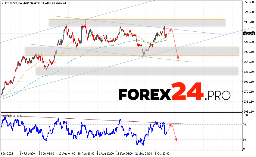 Ethereum Forecast and ETH/USD Analysis for October 9, 2025 suggests an attempt at a bullish correction and a test of the resistance area near 4605. From there, a rebound and continued decline in the ETH/USD cryptocurrency to below 3725 should be expected. A test of the trendline on the relative strength indicator (RSI) would be an additional signal for a decline in Ethereum. A break of the support area at 4985 would invalidate the downward trend, indicating continued upside with a potential target above 5565.