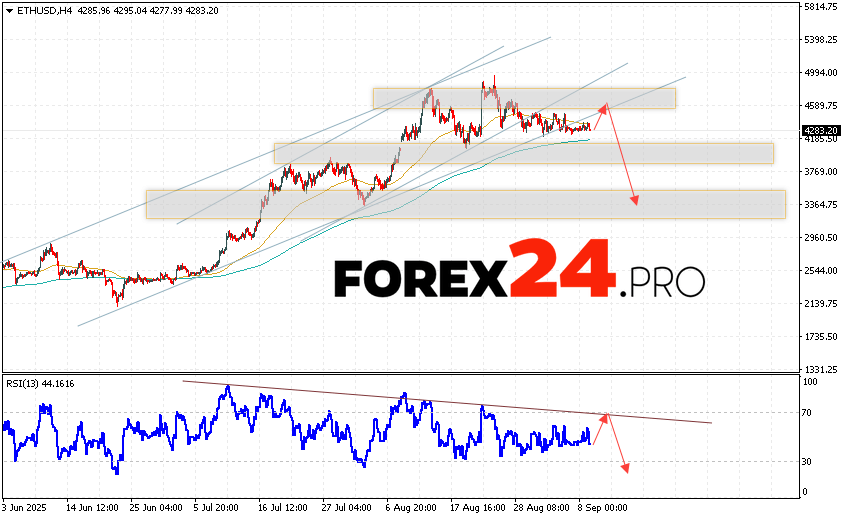 Ethereum Forecast and ETHUSD Analysis for September 10, 2025 suggests an attempt at a bullish correction and a test of the resistance area near the 4575 level. Where should we expect a rebound and continued fall of the ETH/USD cryptocurrency to the area below the 3365 level. An additional signal in favor of a decline in Ethereum will be a test of the trend line on the relative strength indicator. The cancellation of the digital currency fall option will be a breakout of the 5035 resistance area. Which will indicate continued growth of the digital currency with a potential target above the 5975 level.