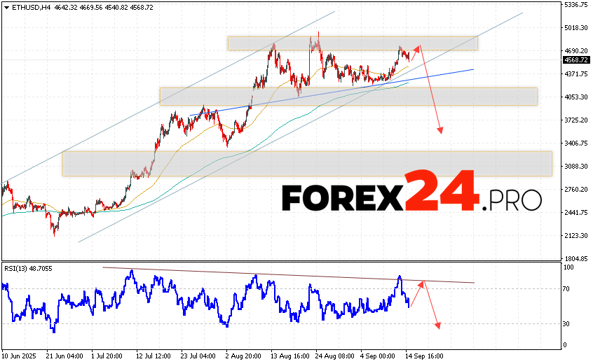 Ethereum Forecast and ETH/USD Analysis for September 17, 2025 suggests an attempt at a bullish correction and a test of the resistance area near the level of 4705. Where should we expect a rebound and continued fall of the ETH/USD cryptocurrency to the area below the level of 3645. An additional signal in favor of the decline of Ethereum will be a test of the trend line on the relative strength indicator. The cancellation of the option of the fall of the digital currency will be a breakout of the resistance area of 5105. Which will indicate continued growth of the digital currency with a potential target above the level of 5365.