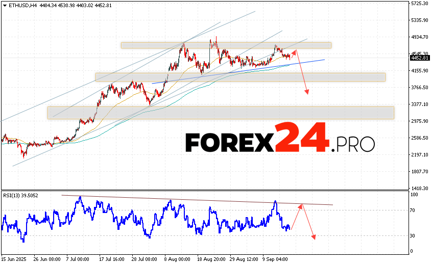 Ethereum Forecast and ETH/USD Analysis for September 18, 2025 suggests an attempt at a bullish correction and a test of the resistance area near 4545. From there, a rebound and continued decline in the ETH/USD cryptocurrency to below 3765 should be expected. A test of the trendline on the relative strength indicator (RSI) would be an additional signal for a decline in Ethereum. A break of the resistance area at 5165 would invalidate this downward scenario, indicating continued growth with a potential target above 5485.