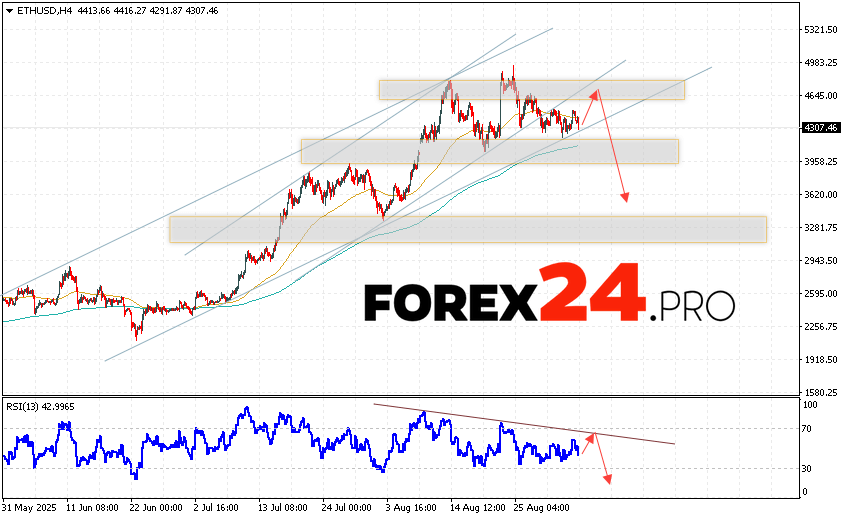 Ethereum Forecast and ETH/USD Analysis for September 5, 2025 suggests an attempt at a bullish correction and a test of the resistance area near the level of 4645. Where should we expect a rebound and continued fall of the ETH/USD cryptocurrency to the area below the level of 3625. An additional signal in favor of the decline of Ethereum will be a test of the trend line on the relative strength indicator. The cancellation of the option of the fall of the digital currency will be a breakout of the resistance area of 5075. Which will indicate continued growth of the digital currency with a potential target above the level of 5845.