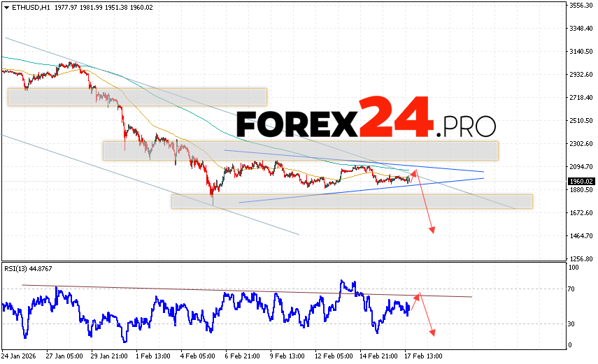 Ethereum Forecast and ETHUSD Analysis for February 18, 2026 suggests an attempt at a bullish correction and a test of the resistance area near 2005. From there, a rebound and continued decline in the ETH/USD cryptocurrency to below 1465 should be expected. A test of the trendline on the relative strength indicator (RSI) would be an additional signal for a decline in Ethereum. A break of the 2265 resistance area would invalidate the downward trend, indicating continued upward movement with a potential target above 2775.