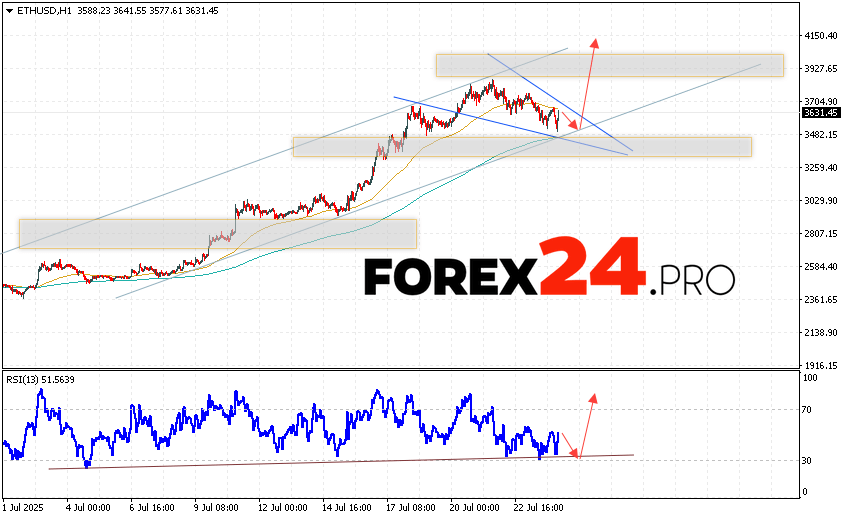 Ethereum Forecast and ETHUSD Analysis for July 25, 2025 suggests an attempt at a bearish correction and a test of the support area near the 3505 level. From there, we can expect a rebound and continued growth of the ETH/USD cryptocurrency to an area above the 4155 level. An additional signal in favor of Ethereum’s growth will be a test of the trend line on the relative strength indicator. A breakout of the 3245 support area will cancel the option of a rise in the digital currency. This will indicate a continuation of the digital currency’s decline with a potential target below the 2775 level.