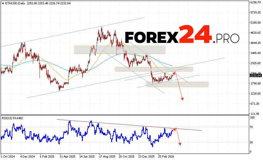 Ethereum Forecast ETH/USD April 13 – 17, 2026 suggests an attempt to develop a bullish correction and test the resistance area near 2345. From there, a downward rebound and continued decline in the cryptocurrency to below 745 should be expected. A test of the trend line on the relative strength indicator (RSI) would also signal a decline in Ethereum. A strong rally and a breakout of the 2805 area would cancel the downside scenario. In this case, we should expect continued growth with a target above the 3525 area.
