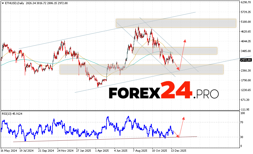 Ethereum Forecast ETH/USD December 22 – 26, 2025 suggests an attempt to develop a bearish correction and test the support area near 2405. From there, an upward rebound and continued growth above 4045 should be expected. A test of the trend line on the relative strength indicator (RSI) would also signal an upward price move. The upside scenario would be cancelled if the price falls and breaks above 1665. In this case, we should expect continued decline with a target below 905.