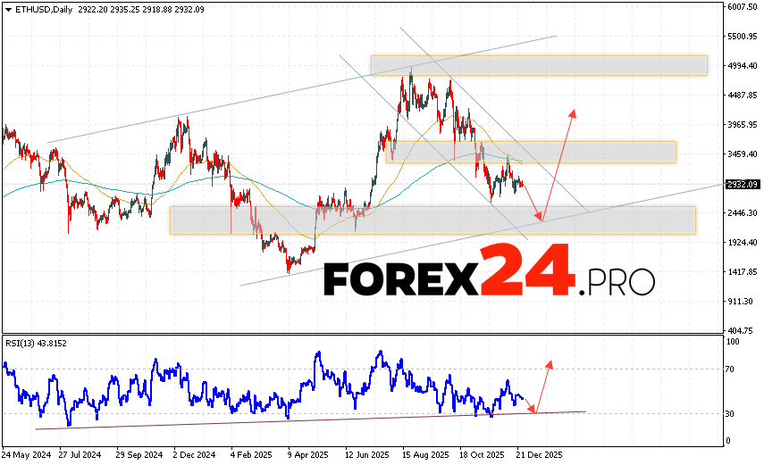 Ethereum Forecast ETH/USD December 29, 2025 — January 2, 2026 suggests an attempt to develop a bearish correction and test the support area near 2415. From there, an upward rebound and continued growth above 3975 should be expected. A test of the trend line on the relative strength indicator (RSI) will serve as an additional signal in favor of Ethereum’s price rise. The upside scenario would be cancelled if the price falls and breaks below 1725. In this case, we should expect continued decline with a target below 965.