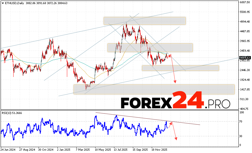 Ethereum Forecast ETH/USD January 12 – 16, 2026 suggests an attempt to develop a bullish correction and test the resistance area near 3165. From there, a downward rebound and continued decline to below 1865 should be expected. A test of the trend line on the relative strength indicator (RSI) would also signal a decline in Ethereum. A strong rally and a breakout of the 3705 area would cancel the downside scenario. In this case, we should expect continued growth with a target above the 4205 area.
