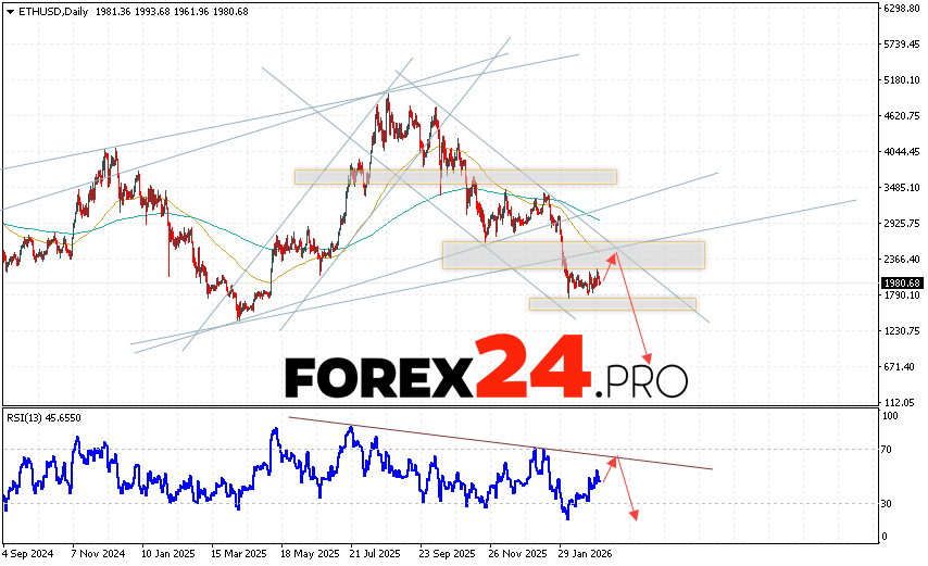 Ethereum Forecast ETH/USD March 9 – 13, 2026 suggests an attempt to develop a bullish correction and test the resistance area near 2345. From there, a downward rebound and continued decline to below 675 should be expected. A test of the trendline on the relative strength indicator (RSI) would also signal a decline in Ethereum. A strong rally and a breakout of the 2995 area would cancel the downside scenario. In this case, we should expect continued growth with a target above the 3635 area.