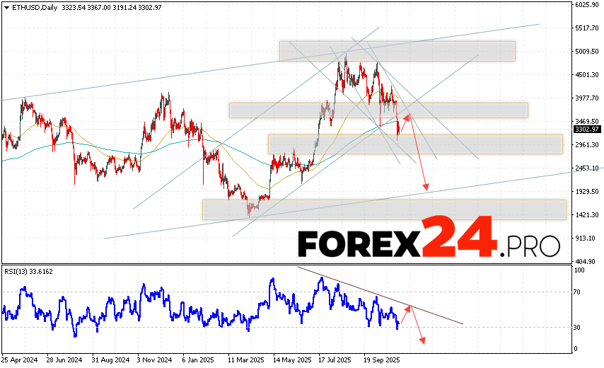 Ethereum Forecast ETH/USD November 10 – 14, 2025 suggests an attempt to develop a bullish correction and test the resistance area near 3475. From there, a downward rebound and continued decline to below 5645 should be expected. A test of the trendline on the relative strength indicator (RSI) would also signal a decline in Ethereum. The decline scenario would be cancelled if a strong rally and a breakout of the 2825 area were to occur. In this case, we should expect continued growth with a target above the 2275 area.
