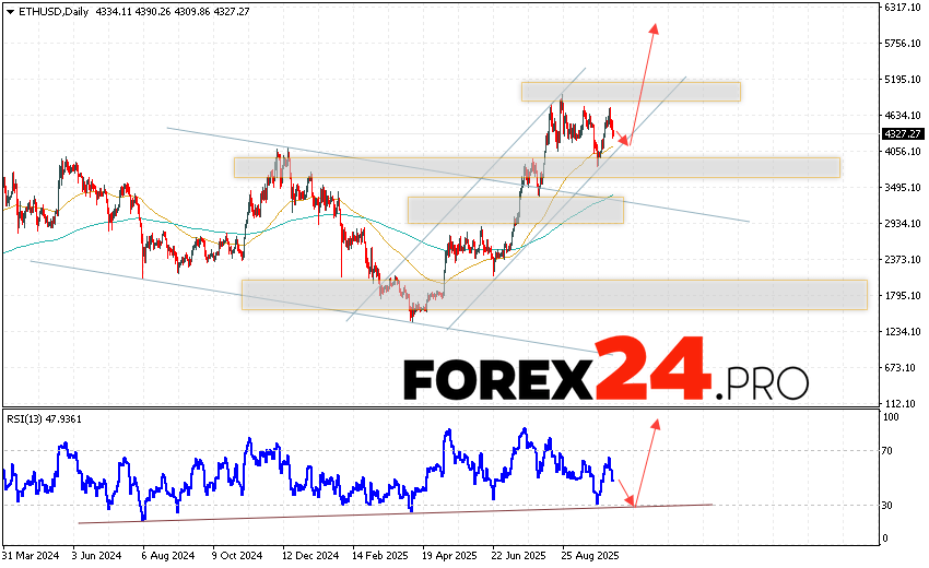 Ethereum Forecast ETH/USD October 13 – 17, 2025 suggests an attempt at a bearish correction and a test of the support area near 4075. From there, an upward rebound and continued growth above 5775 should be expected. A test of the trendline on the relative strength indicator (RSI) would also signal an upward price movement. The upside scenario would be cancelled if the price falls and breaks above 3475. In this case, we should expect continued decline with a target below 2945.