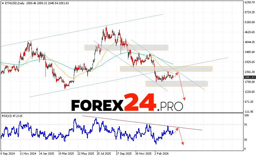 Ethereum Forecast ETHUSD April 6 – 10, 2026 suggests an attempt to develop a bullish correction and test the resistance area near 2345. From there, a downward rebound and continued decline to below 675 should be expected. A test of the trendline on the relative strength indicator (RSI) would be an additional signal of a decline in Ethereum. A strong rally and a breakout of the 2785 area would cancel the downward scenario. In this case, we should expect continued growth with a target above the 3475 area.