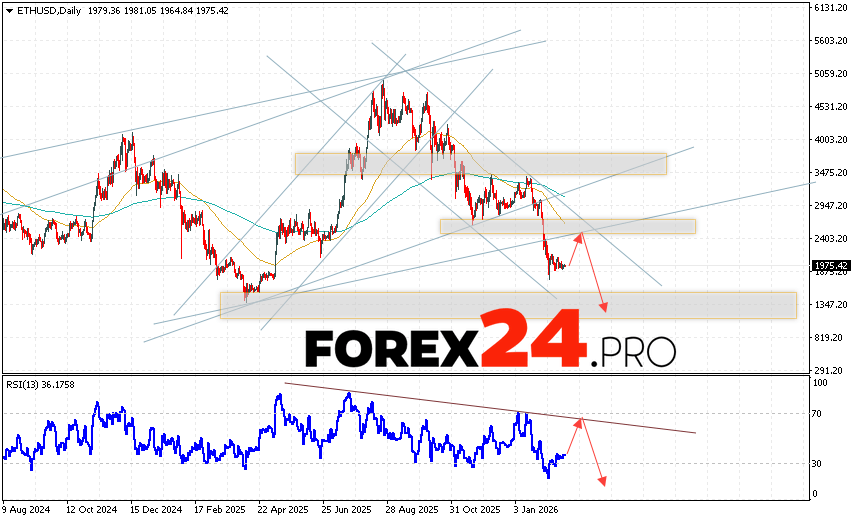 Ethereum Forecast ETHUSD February 23 – 27, 2026 suggests an attempt to develop a bullish correction and test the resistance area near 2405. From there, a downward rebound and continued decline to below 1345 should be expected. A test of the trendline on the relative strength indicator (RSI) would also signal a decline in Ethereum. A strong rally and a breakout of the 2965 area would cancel the downward scenario. In this case, we should expect continued growth with a target above the 3855 area.