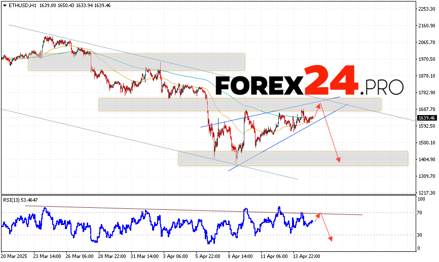 Ethereum Forecast for April 16, 2025 suggests an attempt at a bullish correction and a test of the resistance area near the 1705 level. Where should we expect a rebound and continued fall of the ETH/USD cryptocurrency to the area below the 1405 level. An additional signal in favor of a decline in Ethereum will be a test of the trend line on the relative strength indicator. The cancellation of the digital currency fall option will be a breakout of the 1865 area. Which will indicate continued growth of the digital currency with a potential target above the 2285 level.
