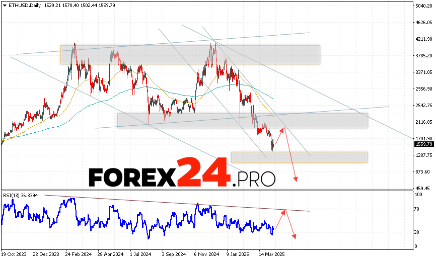 Ethereum Weekly Forecast April 14 — 18, 2025 suggests an attempt to develop a bullish correction and test the resistance area near the 1745 level. From where we should expect a downward rebound and continued fall of the cryptocurrency to the area below the 845 level. An additional signal in favor of a decrease in the Ethereum rate will be a test of the trend line on the relative strength indicator. The cancellation of the fall option will be a strong growth and a breakout of the 2575 area. In this case, we should expect continued growth with a target above the 3185 area.