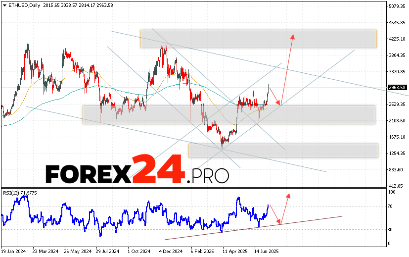 Ethereum Weekly Forecast ETH/USD July 14 — 18, 2025 suggests an attempt to develop a bearish correction and test the support area near the 2565 level. From there, we can expect an upward rebound and continued growth of the cryptocurrency to an area above the 4225 level. An additional signal in favor of the rise in the Ethereum rate will be a test of the trend line on the relative strength indicator. A fall and breakout of the 2065 area will cancel the growth scenario. In this case, we should expect a continuation of the decline with a target below the 1745 area.
