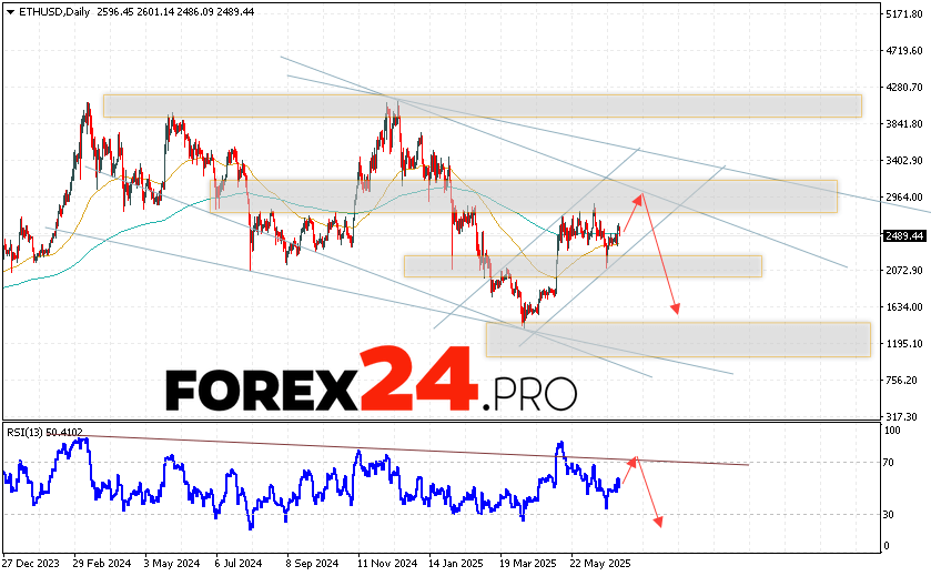 Ethereum Weekly Forecast ETH/USD July 7 — 11, 2025 suggests an attempt to develop a bullish correction and test the resistance area near the level of 2965. From where we should expect a downward bounce and a continuation of the cryptocurrency’s fall to the area below the level of 1645. An additional signal in favor of a decline in the rate of Ethereum will be a test of the trend line on the relative strength indicator. Cancellation of the fall option will be a strong growth and breakdown of the area of 3265. In this case we should expect the continuation of the rise with a target above the 3645 area.