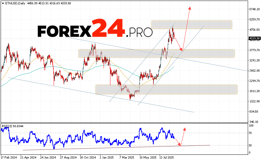 Ethereum Weekly Forecast ETH/USD September 1 — 5, 2025 suggests an attempt to develop a bearish correction and test the support area near the 3765 level. From where we should expect an upward rebound and continued growth of the cryptocurrency to the area above the 5745 level. An additional signal in favor of the rise in the Ethereum rate will be a test of the trend line on the relative strength indicator. The growth option will be cancelled by a fall and a breakout of the 3145 area. In this case, we should expect a continuation of the decline with a target below the 2365 area.