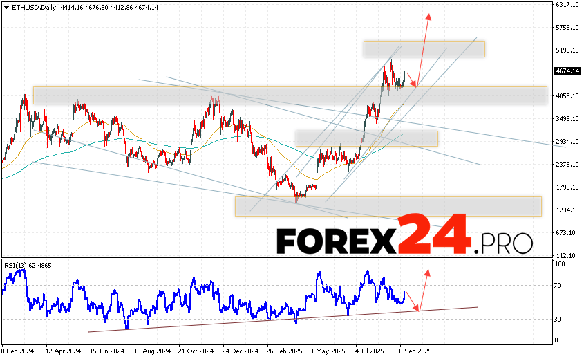 Ethereum Weekly Forecast ETH/USD September 15 – 19, 2025 suggests an attempt to develop a bearish correction and test the support area near the 3645 level. From where we should expect an upward rebound and continued growth of the cryptocurrency to the area above the 5935 level. An additional signal in favor of the rise in the Ethereum rate will be a test of the trend line on the relative strength indicator. The growth option will be cancelled by a fall and a breakout of the 3405 area. In this case, we should expect a continuation of the decline with a target below the 2665 area.