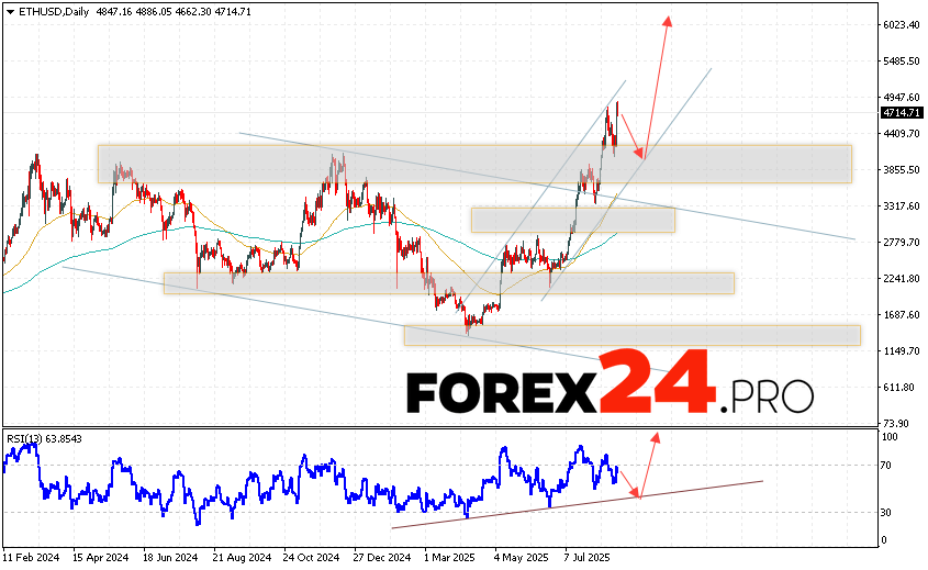 Ethereum Weekly Forecast ETHUSD August 25 — 29, 2025 suggests an attempt to develop a bearish correction and test the support area near the 3925 level. Where should we expect an upward rebound and continued growth of the cryptocurrency to the area above the 6035 level. An additional signal in favor of the rise in the Ethereum rate will be a test of the trend line on the relative strength indicator. The growth option will be cancelled by a fall and a breakout of the 3725 area. In this case, we should expect a continuation of the decline with a target below the 3265 area.